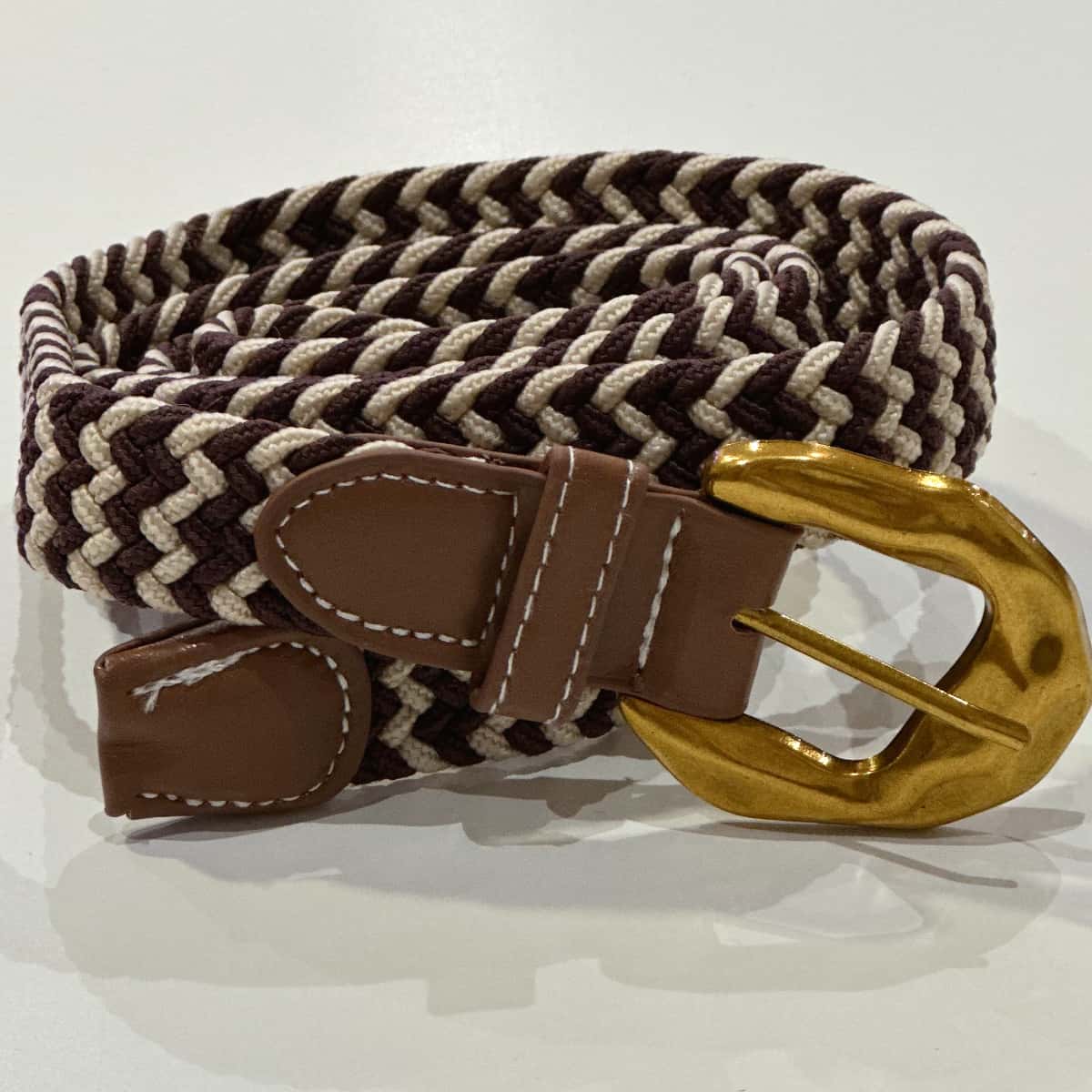 Cette ceinture élastique allie confort et style avec son tressage bicolore marron et beige. Sa boucle dorée apporte une touche lumineuse et féminine à toutes vos tenues, qu’elles soient décontractées ou habillées.