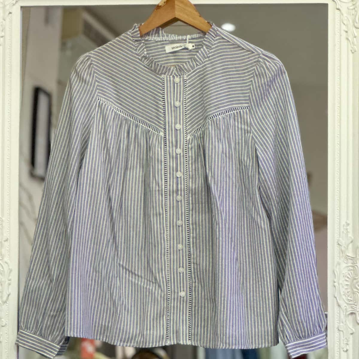 Chemise légère à col mao, ornée de rayures bleu et blanc pour un style intemporel. Un détail ajouré délicat longe la boutonnière, apportant une touche féminine et raffinée. Sa coupe droite et fluide en fait une pièce idéale pour un look élégant au quotidien.