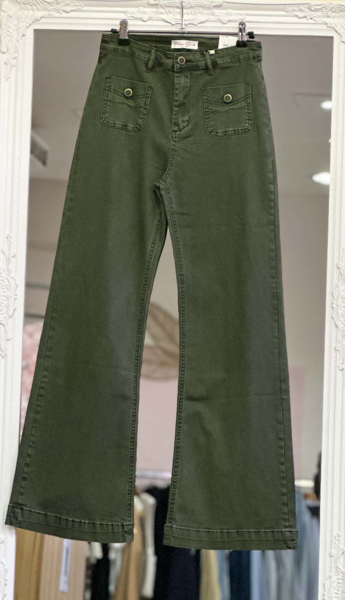 Jean coupe large en toile kaki, doté de poches plaquées sur le devant. Fermeture par de jolis boutons dorés et kaki, qui apportent une touche élégante et originale.