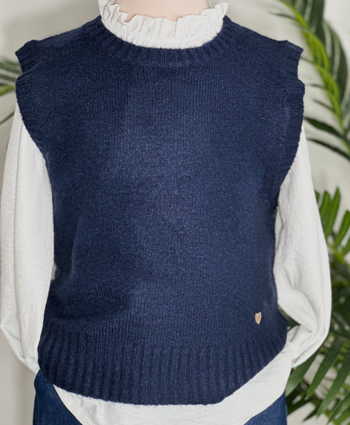 Ce pull sans manche bleu marine est un choix parfait pour les moments de mi-saison, alliant confort, style et une touche de mignonnerie avec son cœur brodé !