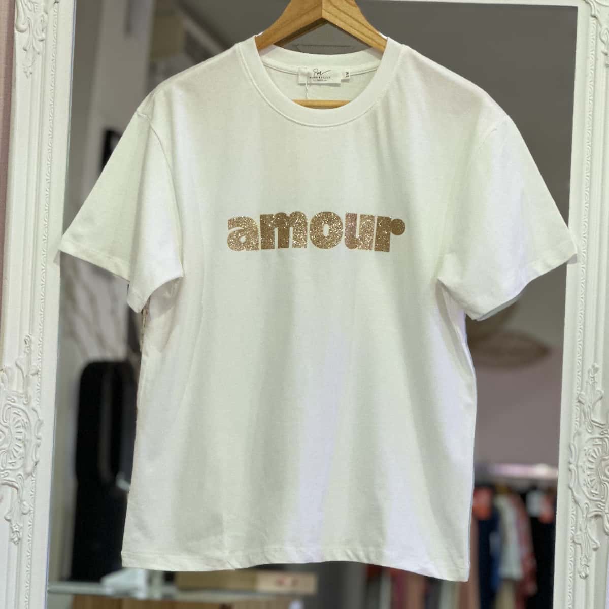 Inscription : "AMOUR" en lettres majuscules floquées de paillettes dorées sur le devant